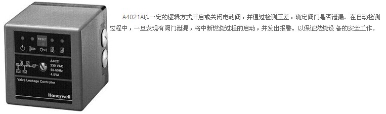 A4020系列通用型阀门泄漏自检系统是以微处理器为基础设计开发的。它以一定的逻辑方式开启或关闭电动阀,并通过检测压差,确定阀门是否泄漏。它可与Honeywell公司7800系列、Satronic系列及其他公司燃烧安全控制器配合使用,对双阀或阀组进行自动检查。在自动检测过程中,一旦发现有阀门泄漏,将中断燃烧过程的启动,并发出报警。以保证燃烧设备的安全工作。